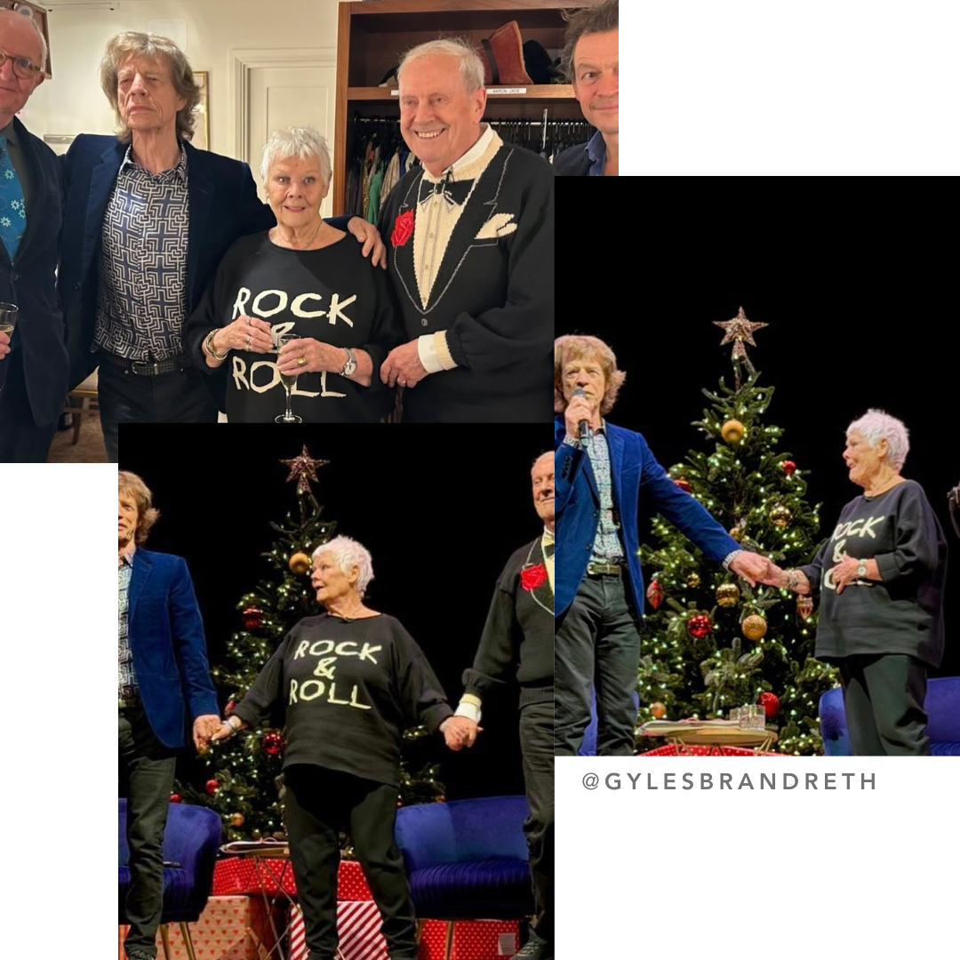 We recently found out that Dame Judi Dench was spotted wearing our Rock & Roll Knit Jumper on stage alongside Mick Jagger and Gyles Brandreth. Still typing that sentence feels a bit unreal. Judi Dench. In Little Lies. With Mick Jagger in the room, and yes, touching the knit. Honestly… iconic doesn’t even cover it.