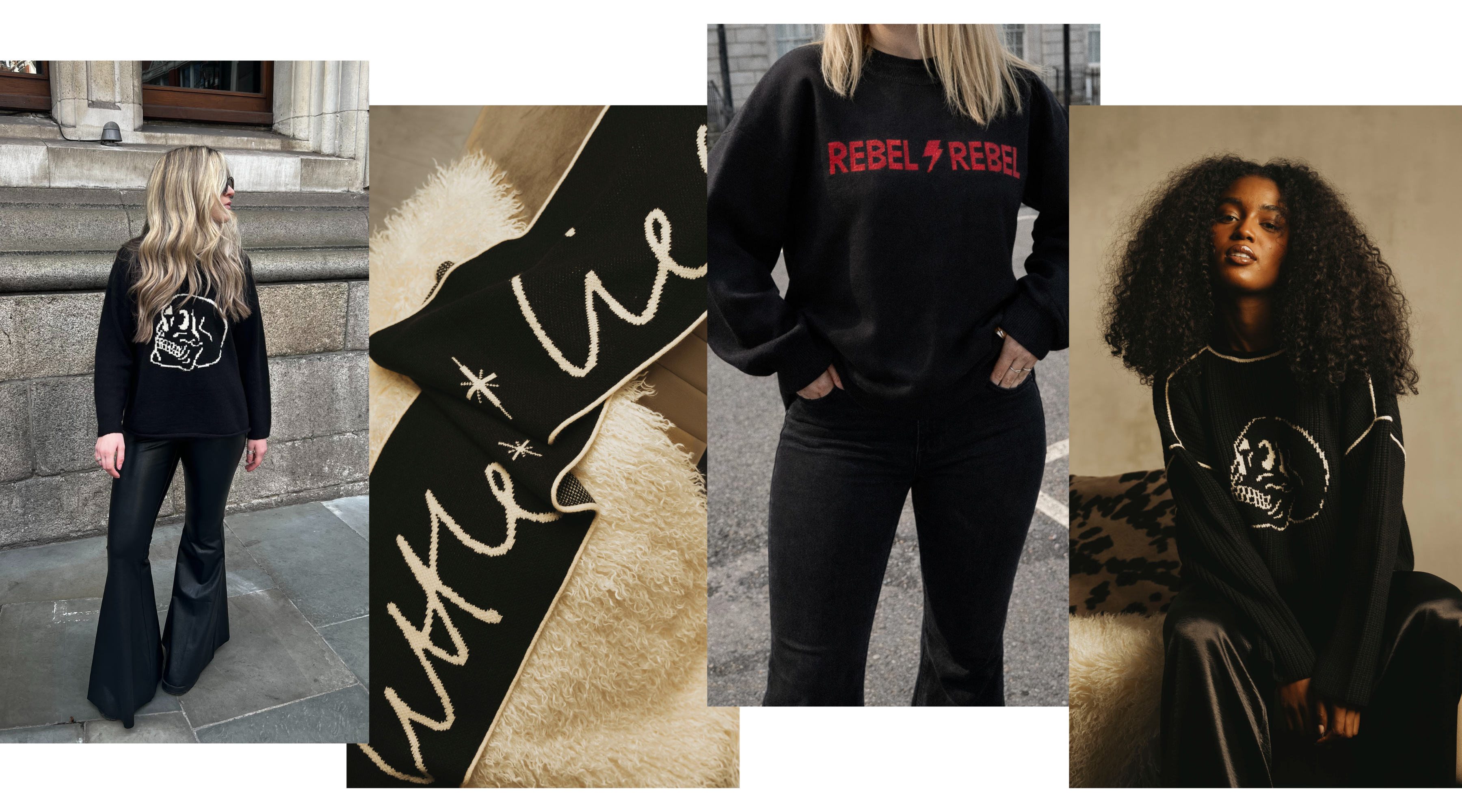 Our monochrome slogan knitwear has even been spotted on the one and only Dame Judy Dench, proving that rock ‘n roll has no age limit and self-expression beats trends every time.