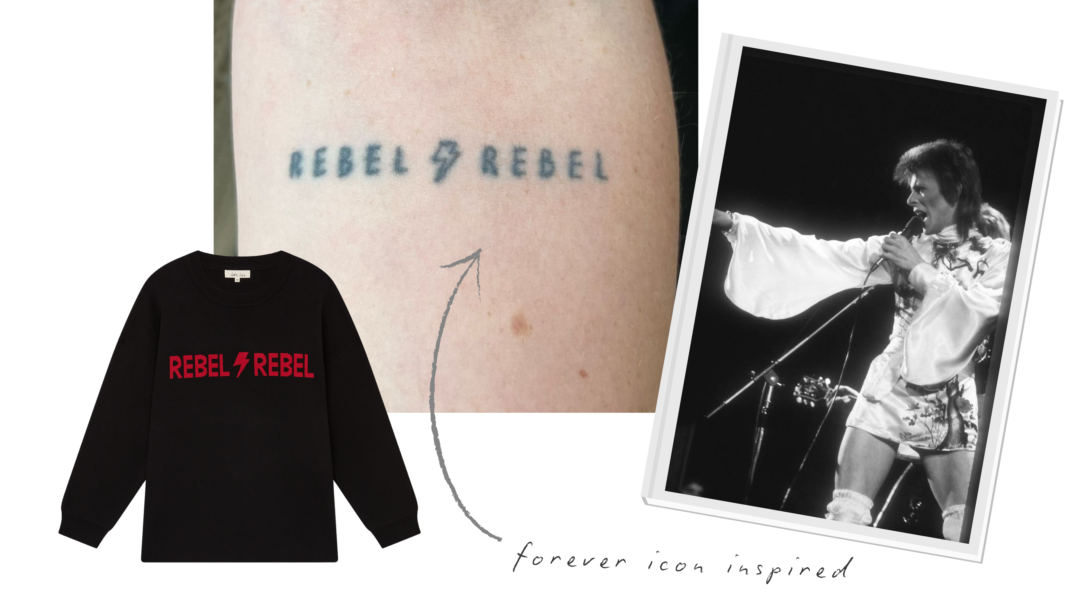 One of our most iconic styles and a repeat bestseller is Rebel Rebel, inspired of course by the inimitable David Bowie. The artwork for this knit actually comes from my own tattoo, which I drew up myself and took to a local tattoo studio to have inked into my skin in 2019 as a reminder to myself to ‘be a little more Bowie.’
